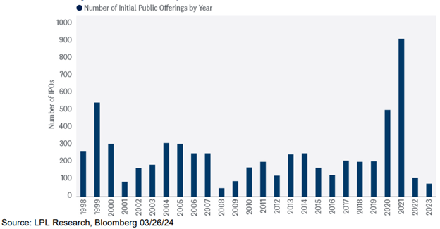 Source: LPL Research, Bloomberg, 03/26/24 Indexes are unmanaged and cannot be invested in directly. Past performance is no guarantee of future results. The Renaissance IPO Index is a diversified portfolio of U.S. listed newly public companies that pass a formulated screening process, weighted by float, capped at 10% and removed after two years.