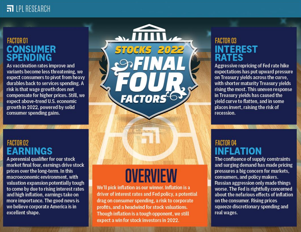 This year’s winner wasn’t as easy to call as last year, when the vaccines won in a rout. We’re picking inflation as our winner because it’s tied so closely to the other key factors. Inflation is a driver of interest rates and Fed policy, a potential drag on consumer spending, a risk to corporate profits, and a headwind for stock valuations. Inflation is also difficult to predict due to the geopolitical uncertainty in Europe and the complexity of ongoing COVID-19 effects on supply chains and labor participation.